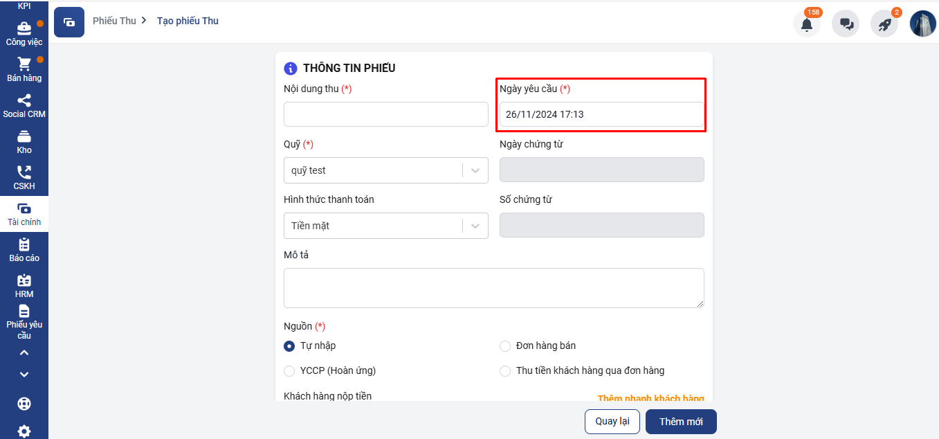 Hiện tại khi tạo phiếu thu/chi trên Getfly, ngày chứng từ ghi nhận mặc định là ngày hiện tại. Trường hợp bạn muốn tạo phiếu thu/chi cho thời điểm quá khứ hoặc tương lai, bạn có thể chỉnh sửa ngày yêu cầu theo đúng thời gian mong muốn.