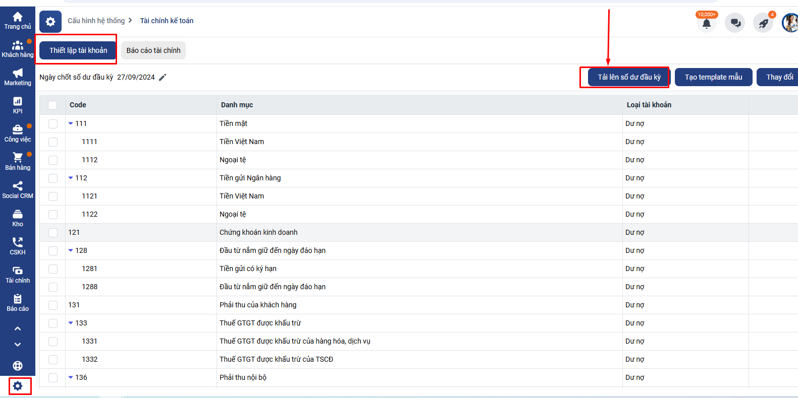 Bước 1. Bạn truy cập vào Getfly ⇒ Cài đặt ⇒ Cấu hình hệ thống ⇒ Tài chính kế toán ⇒ Thiết lập tài khoản ⇒ Tải lên số dư đầu kỳ