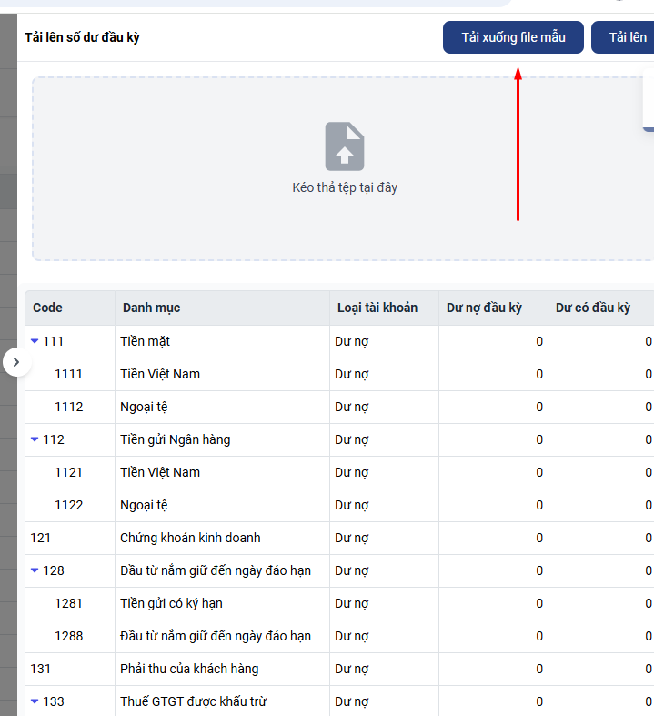 Để tải lên số dư đầu kỳ của các tài khoản tài chính kế toán bạn thao tác như sau: