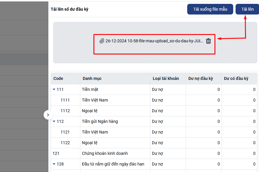 Bước 3: Tải lên file mẫu để cập nhật số dư đầu kì của các tài khoản