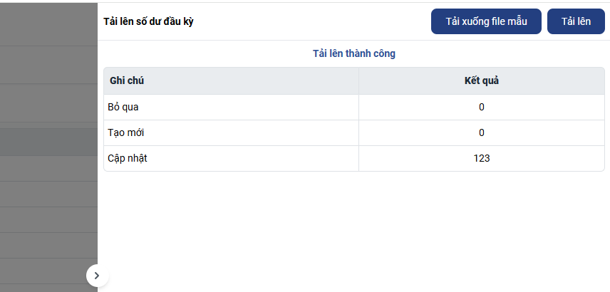 Khi hoàn tất tải lên số dư đầu kỳ thì tất cả các quỹ liên quan đến tài khoản sẽ được cập nhật theo dữ liệu được tải lên và sẽ không thể khôi phục lại dữ liệu trước đó.