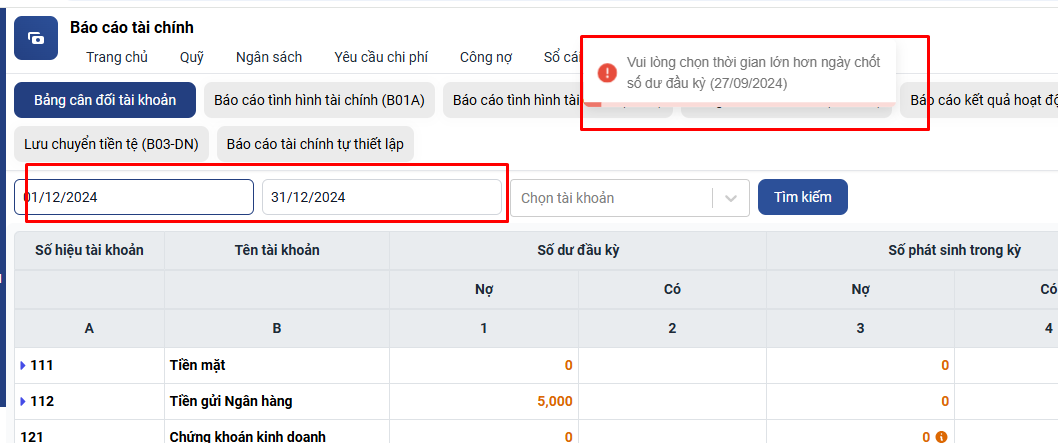 Lưu ý: Nếu quỹ cha có tồn và quỹ con cũng có tồn, hệ thống sẽ tính tổng tồn quỹ của quỹ cha cộng với tồn của các quỹ con trực thuộc.