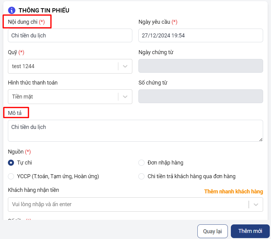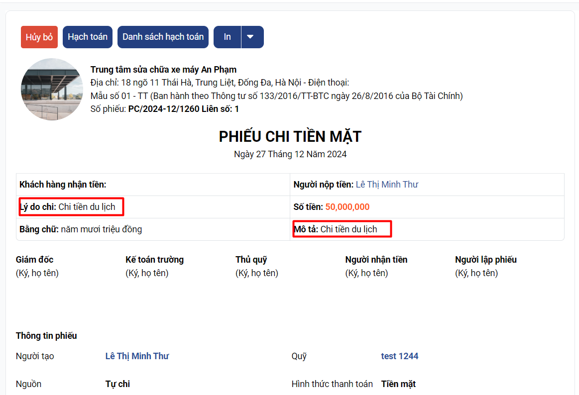 Khi tạo phiếu thu/chi, bạn có thể ghi lý do chi ở nội dung chi hoặc mô tả trong phiếu