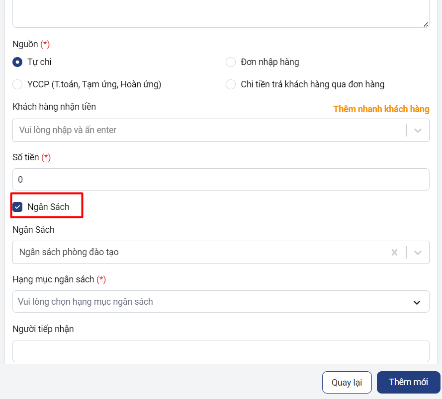 Khách hàng nhận tiền: Chọn khách hàng nhận chi tiền (nếu cần).
