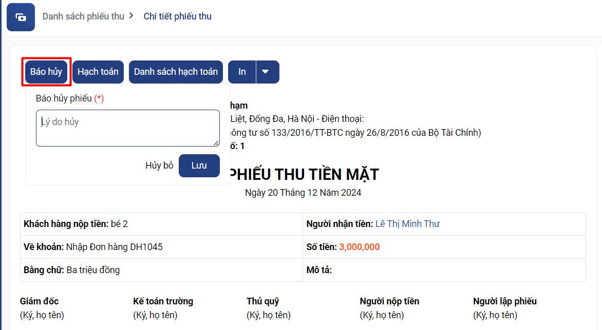 Khi báo hủy phiếu thu/chi đã nhập quỹ, bắt buộc phải điền lý do hủy.