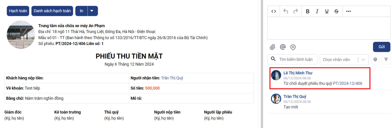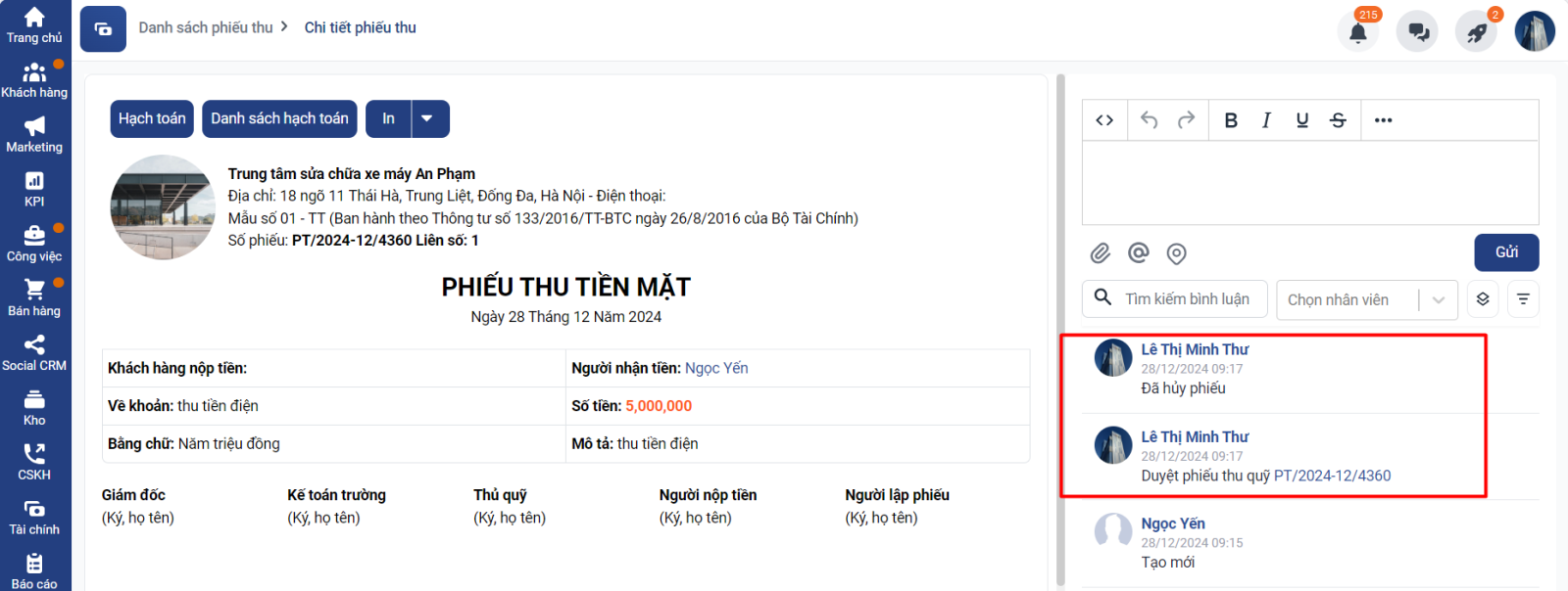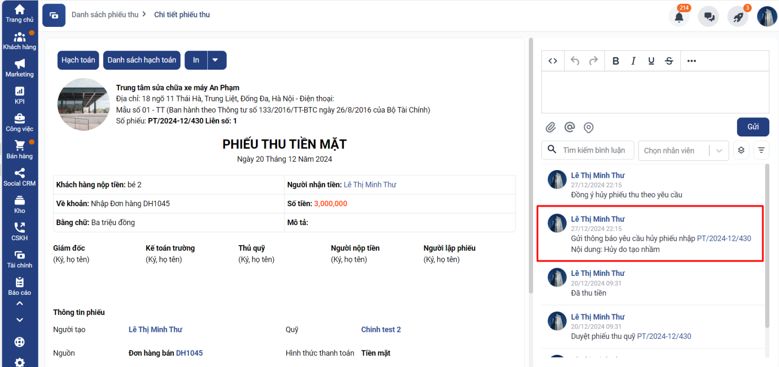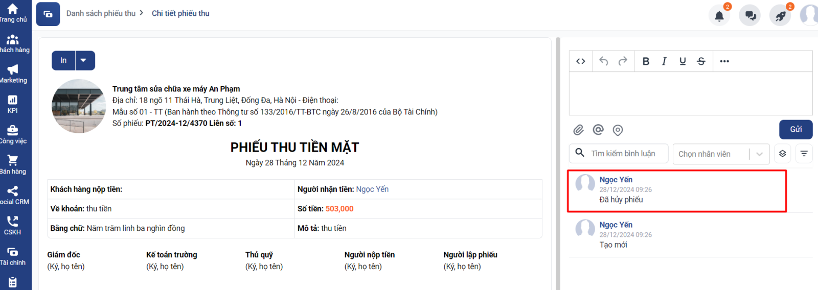 Để xem lý do hủy của phiếu, bạn vào chi tiết phiếu thu/chi và xem logs ở phần trao đổi: