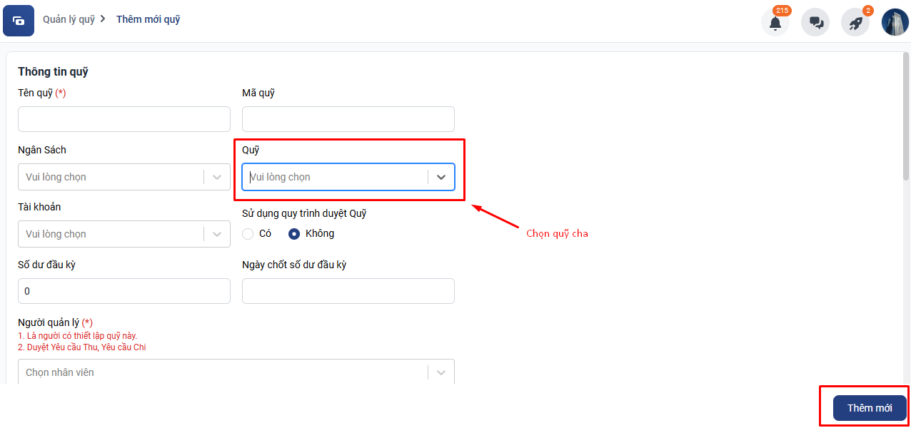 Nhập thông tin cho quỹ con và chọn quỹ cha mà quỹ con sẽ trực thuộc.