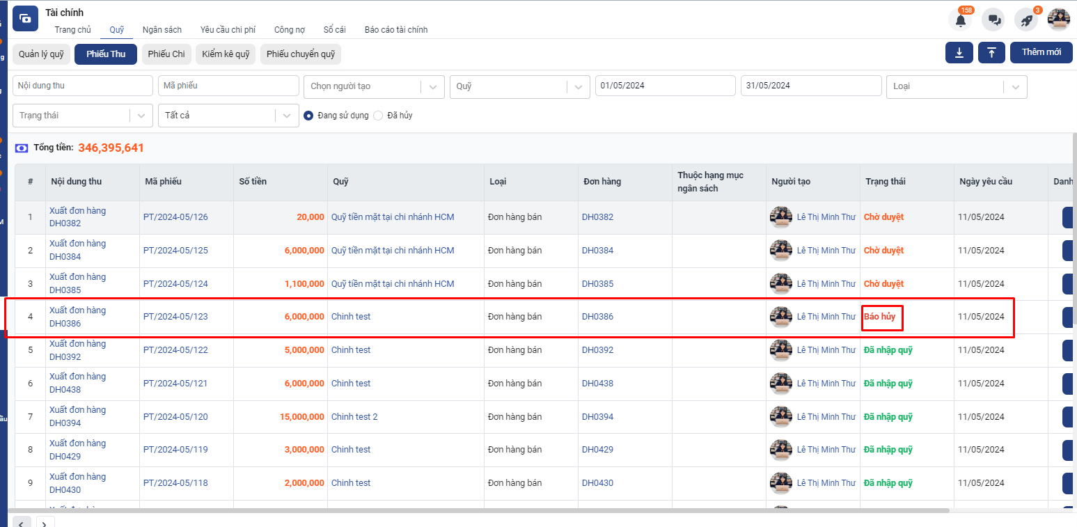 Bước 2: Thủ quỹ / người duyệt quỹ check phiếu thu BÁO HUỶ và click vào nội dung phiếu tương ứng