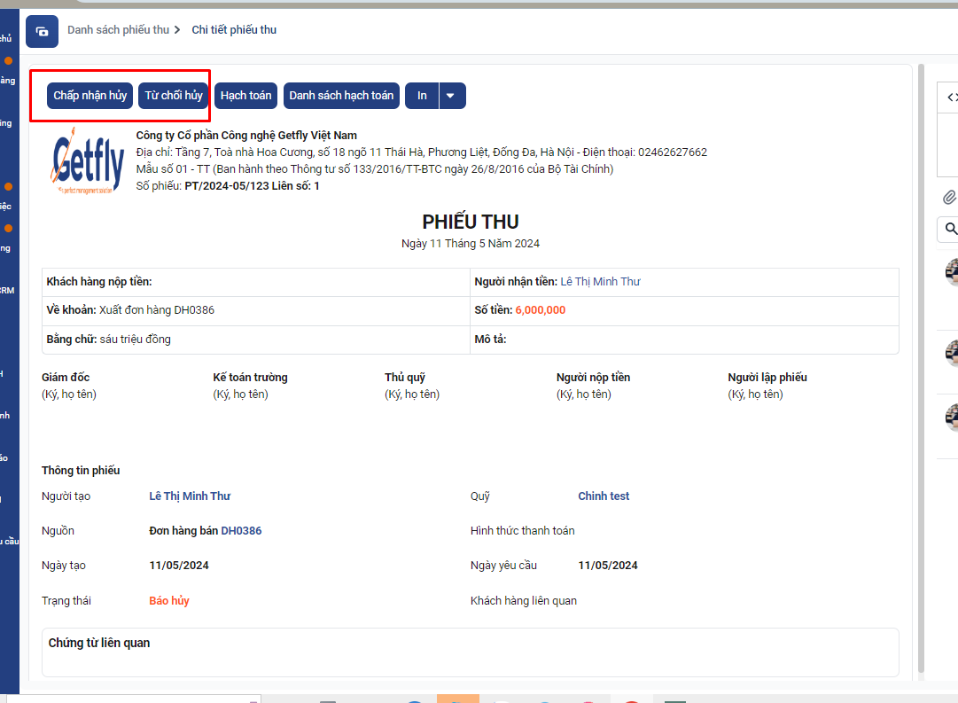 Câu 6. Quy trình hủy phiếu thu chi trên Getfly?