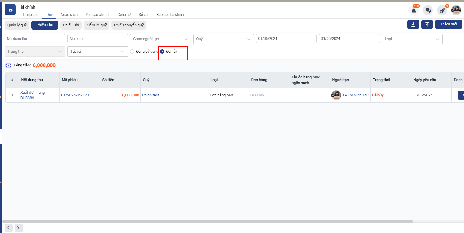 Để xem các phiếu đã hủy, bạn vào mục đã hủy trong phiếu thu để xem lại các phiếu Đã hủy