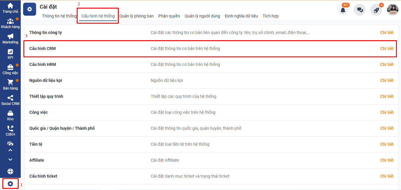 Bước 1: Click vào tác vụ "Cài đặt" → Chọn "Cấu hình hệ thống" → Chọn Cấu hỉnh CRM