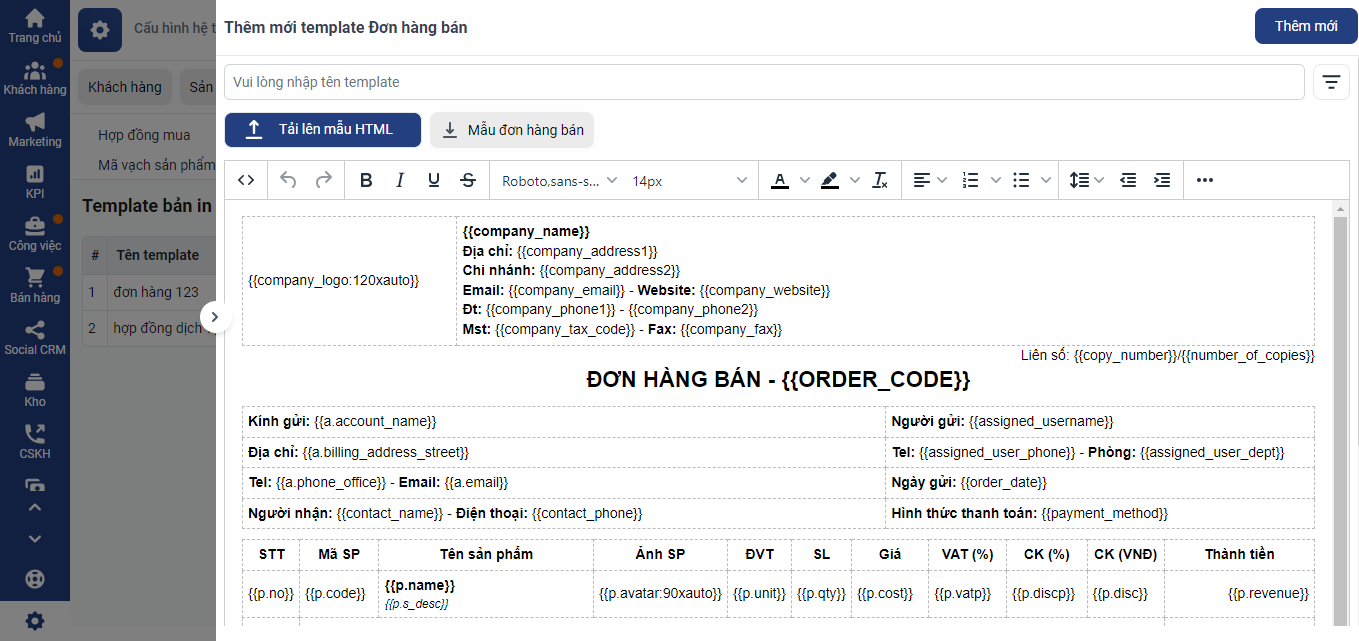 Bước 3: Sau khi lựa chọn một bản in muốn chỉnh sửa, bạn thao tác "Thêm mới". Tại đây sẽ có hai lựa chọn khi tạo Template bản in: "Tải lên mẫu HTML" và "Mẫu đơn hàng bán".