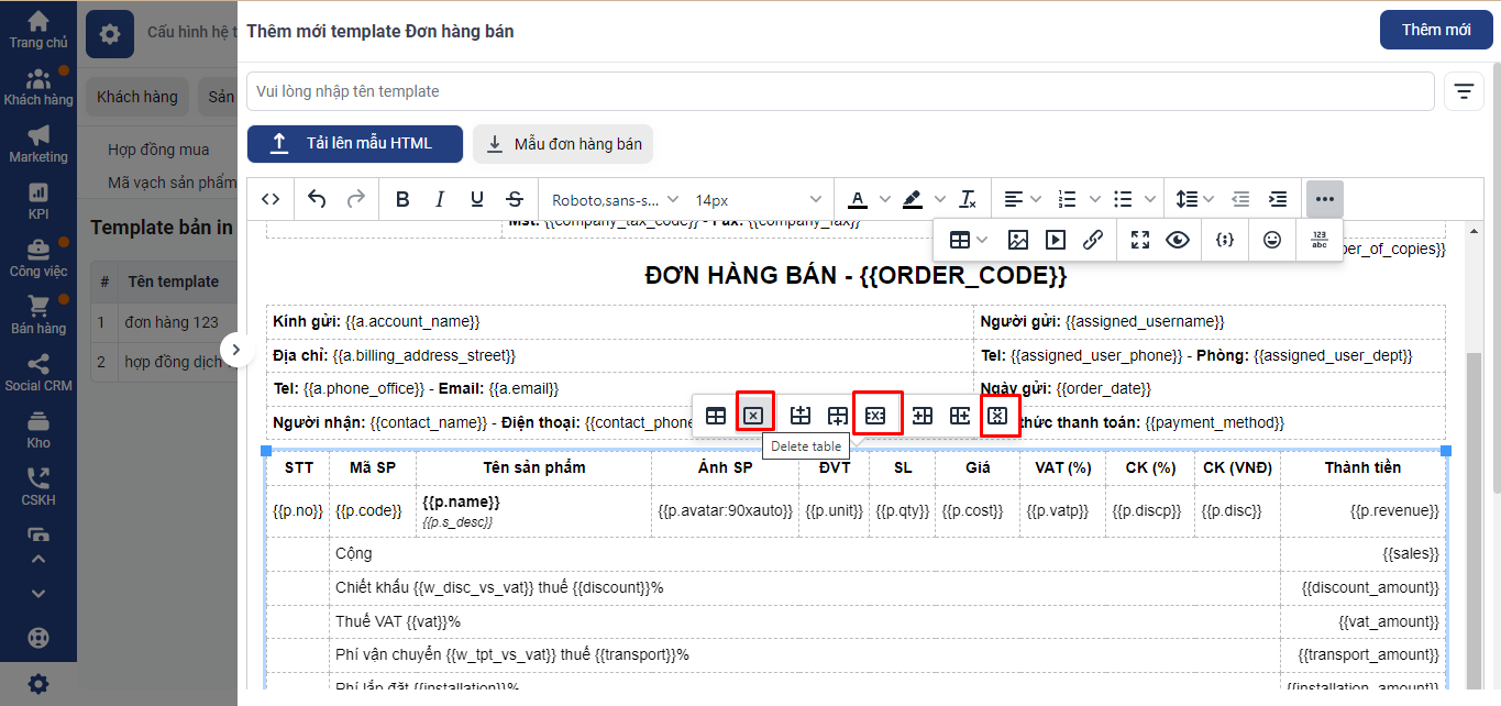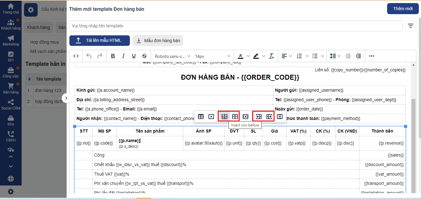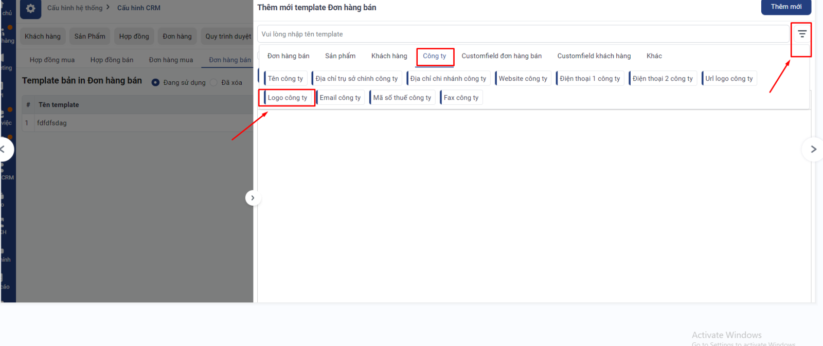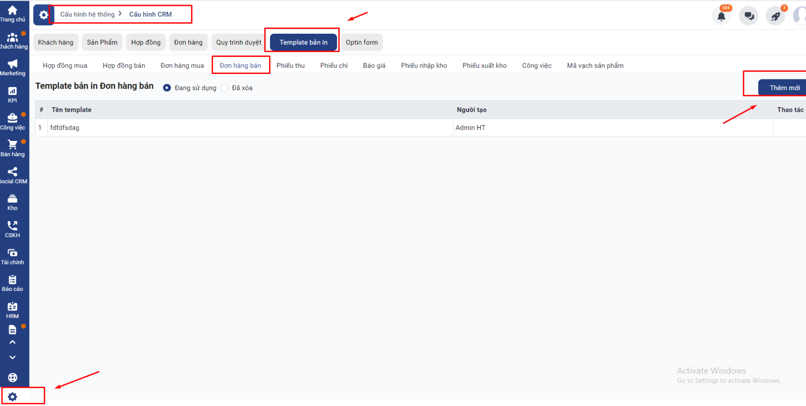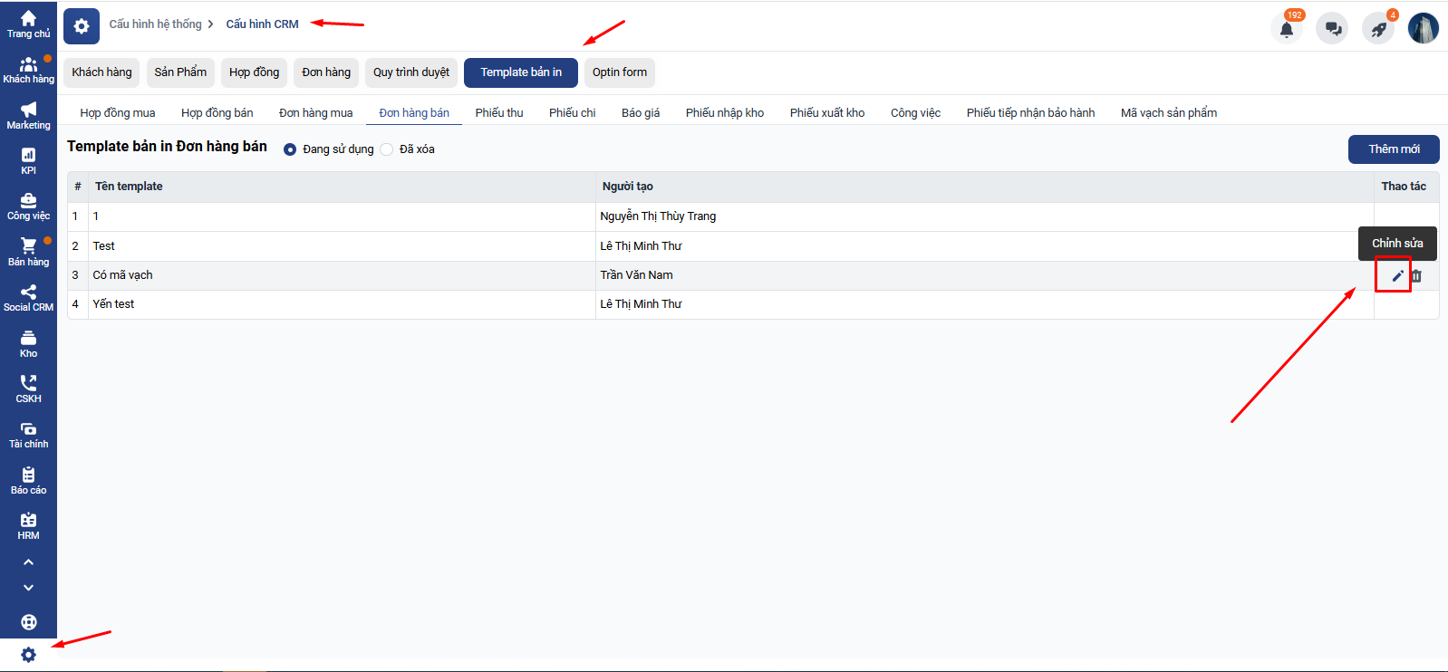 Cài đặt → Cấu hình CRM → Template bản in → Chọn bạn in muốn điều chỉnh → Sửa