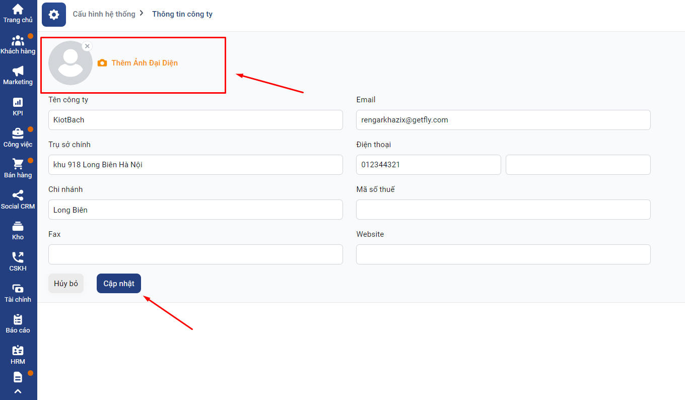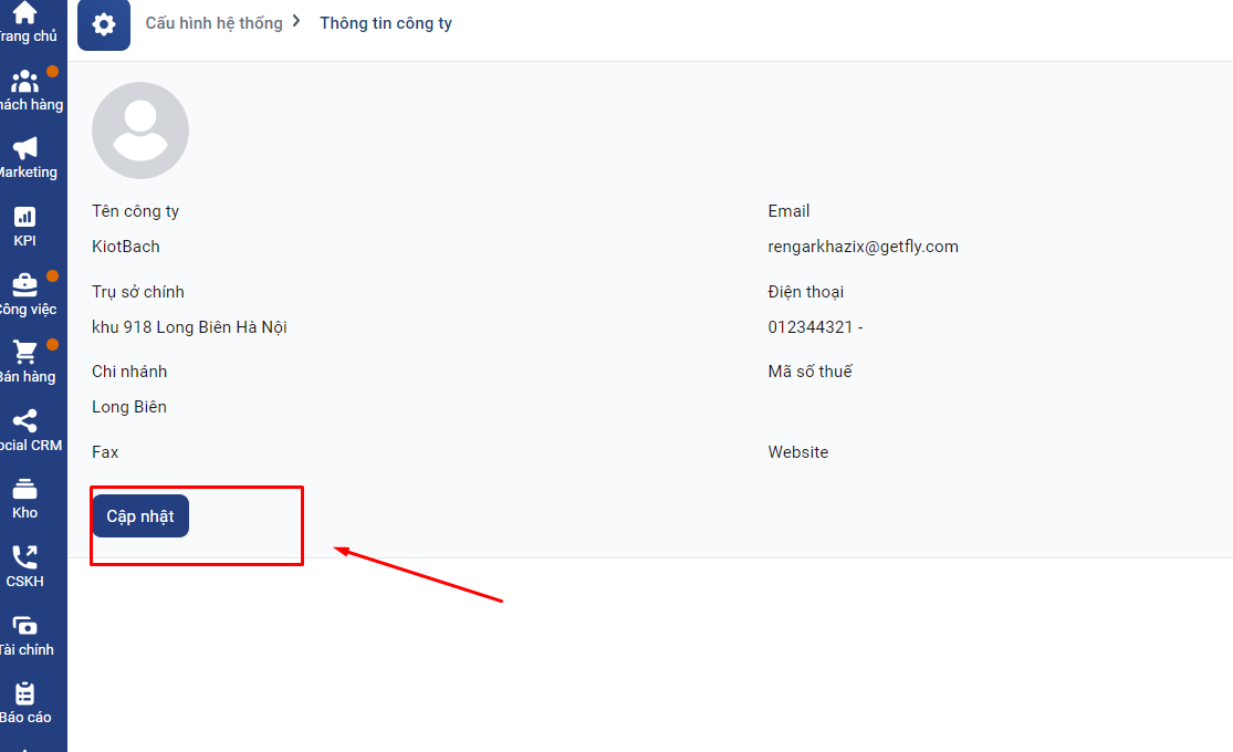 - Bạn vào mục cài đặt => Cấu hình hệ thống => thông tin công ty => ấn cập nhật để thêm ảnh logo công ty