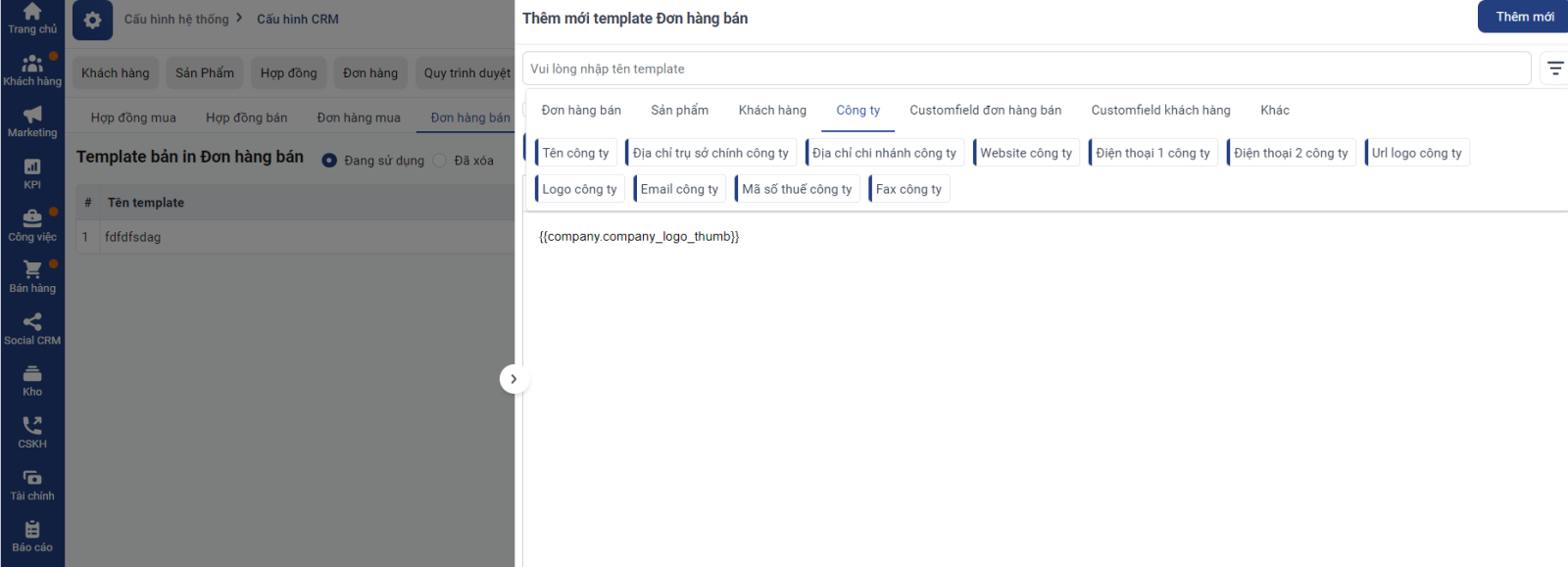 Bước 1: Bạn vào mục cài đặt => chọn cấu hình hệ thống => Cấu hình CRM=> Teamplate bản in đơn hàng => rồi ấn thêm mới để tạo bản in đơn hàng