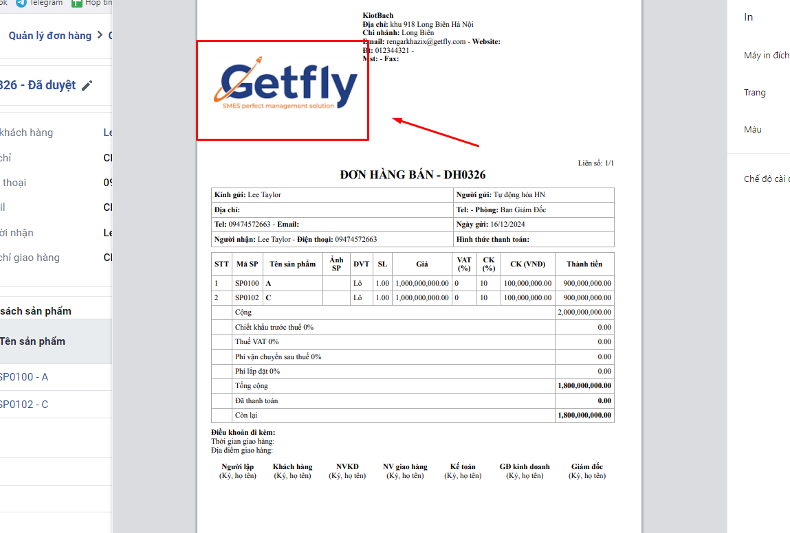 Câu 6. Tại sao khi in đơn hàng từ Getfly thì logo và địa chỉ khách hàng lại không hiển thị?