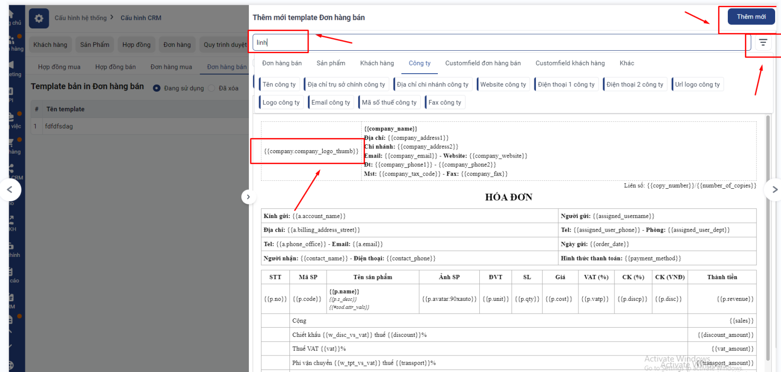 Bước 2: Bạn click vào mục thêm biến => vào phần công ty => và sao chép biến logo công ty và chèn biến vào vị trí mong muốn