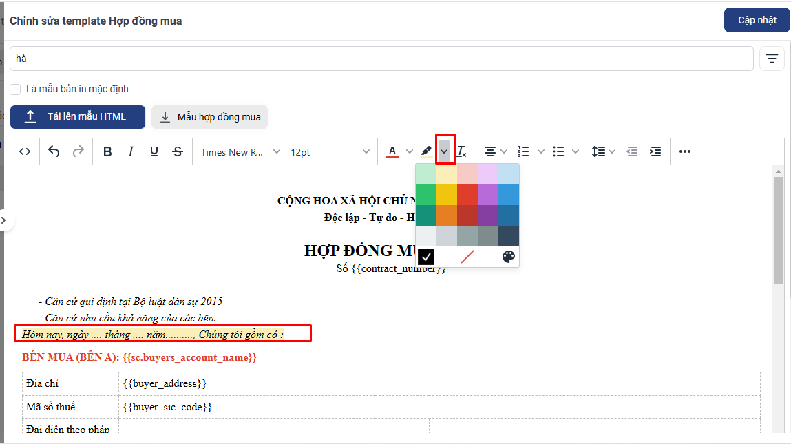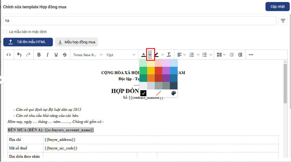 Để chỉnh sửa màu trong bản in, bạn truy cập vào Getfly → Cài đặt → Cấu hình hệ thống → Cấu hình CRM → Template bản in → chọn mẫu in (hợp đồng, đơn hàng,... ) → Bấm chỉnh sửa mẫu
