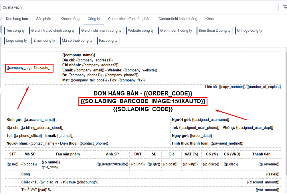 2. Chèn biến logo công ty vào bản in đơn hàng bán