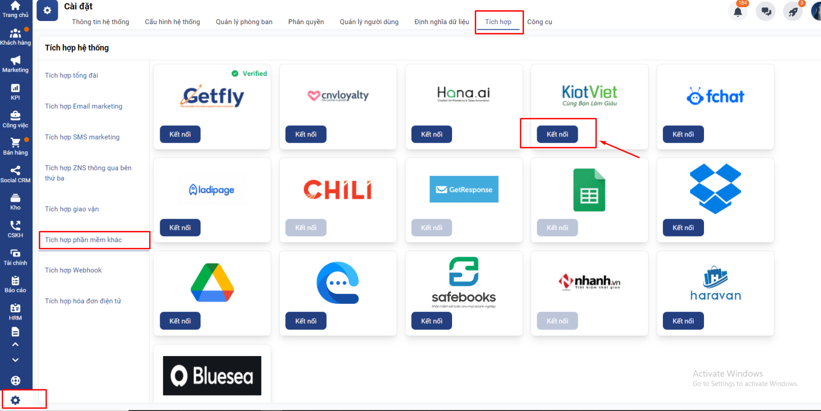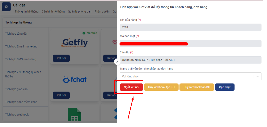Câu 11. Làm thế nào để ngắt kết nối giữa Kiot Việt và Getfly?