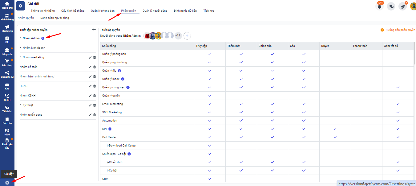 Bạn Truy cập vào Cài đặt => Phân quyền => chọn Nhóm quyền => Tích chọn quyền ở bảng thiết lập