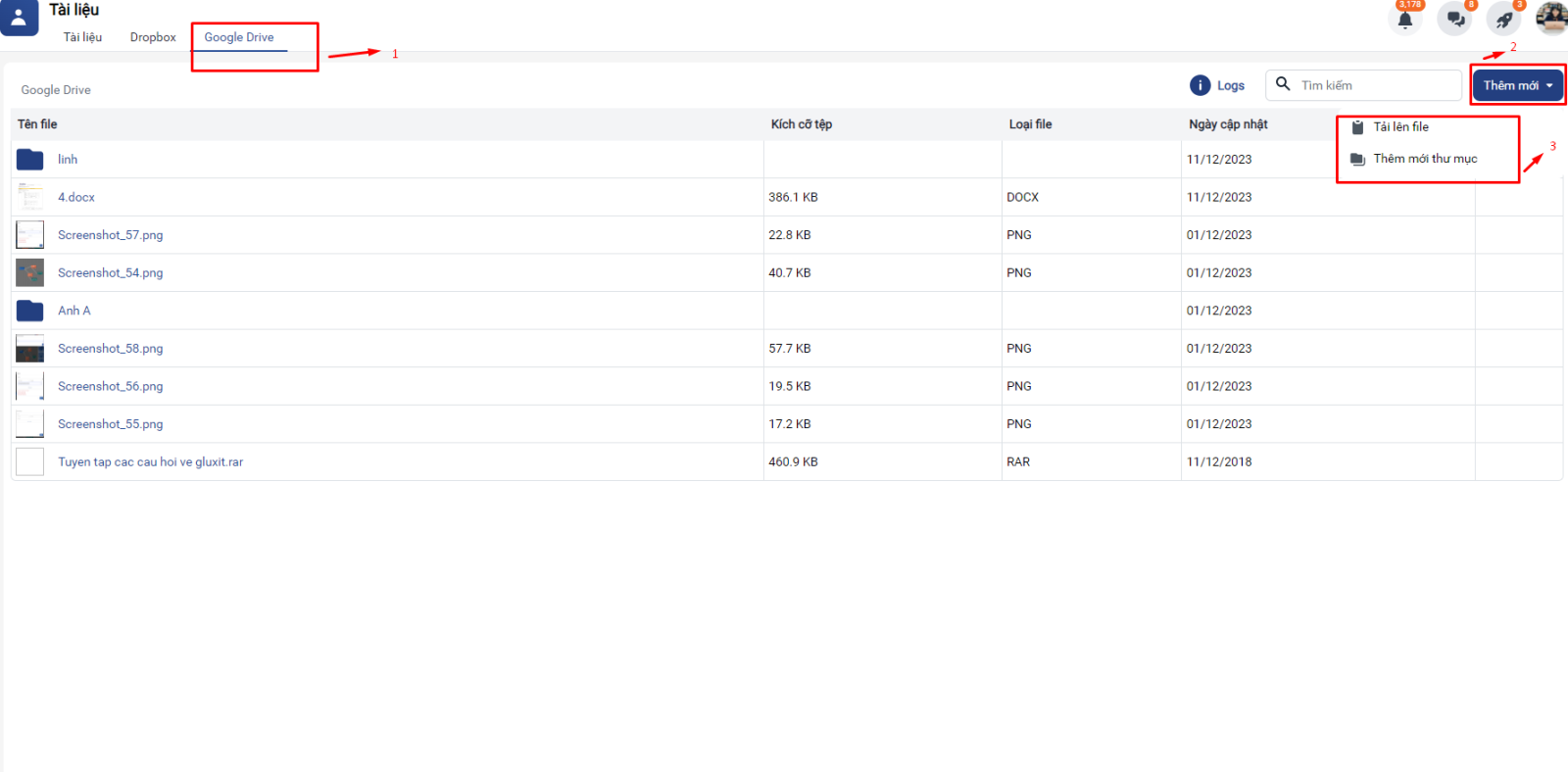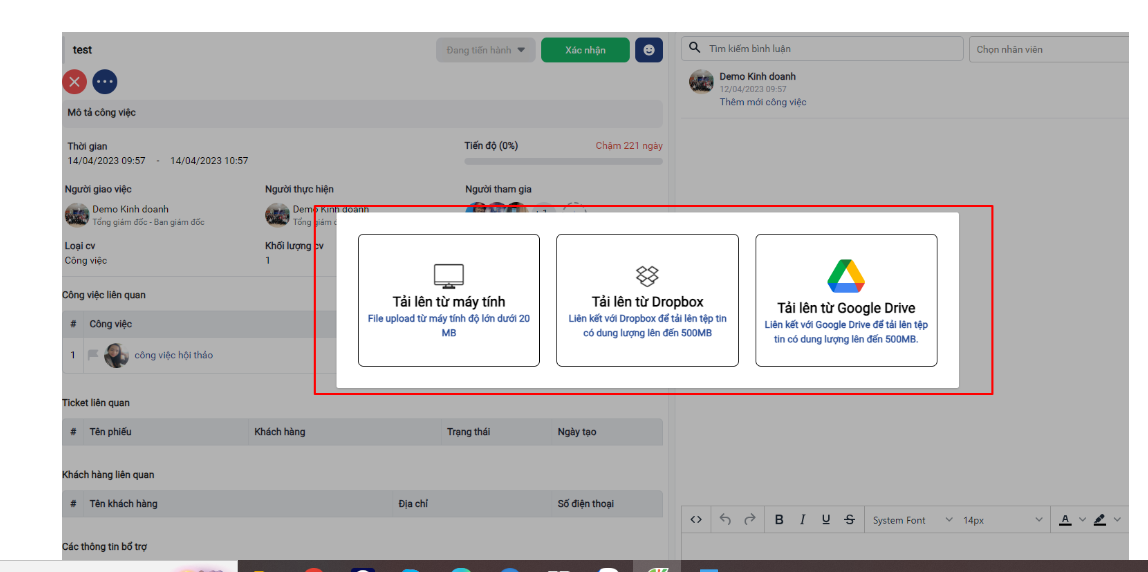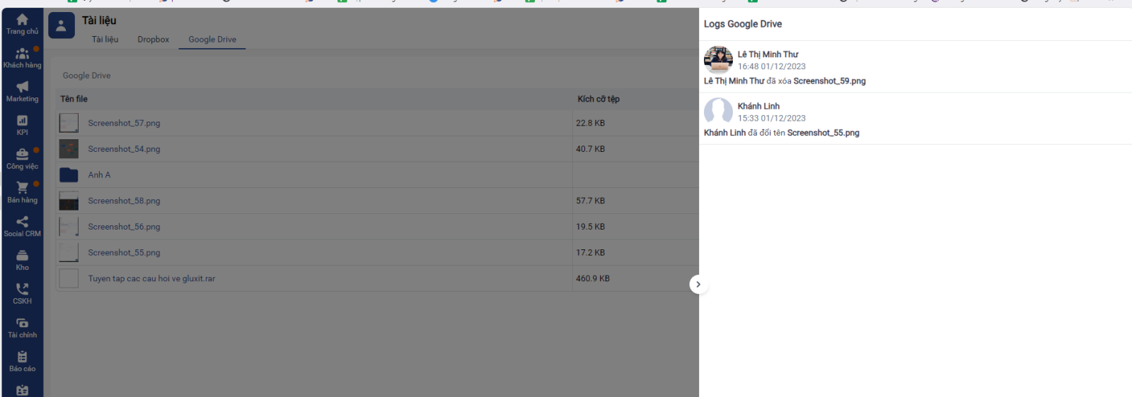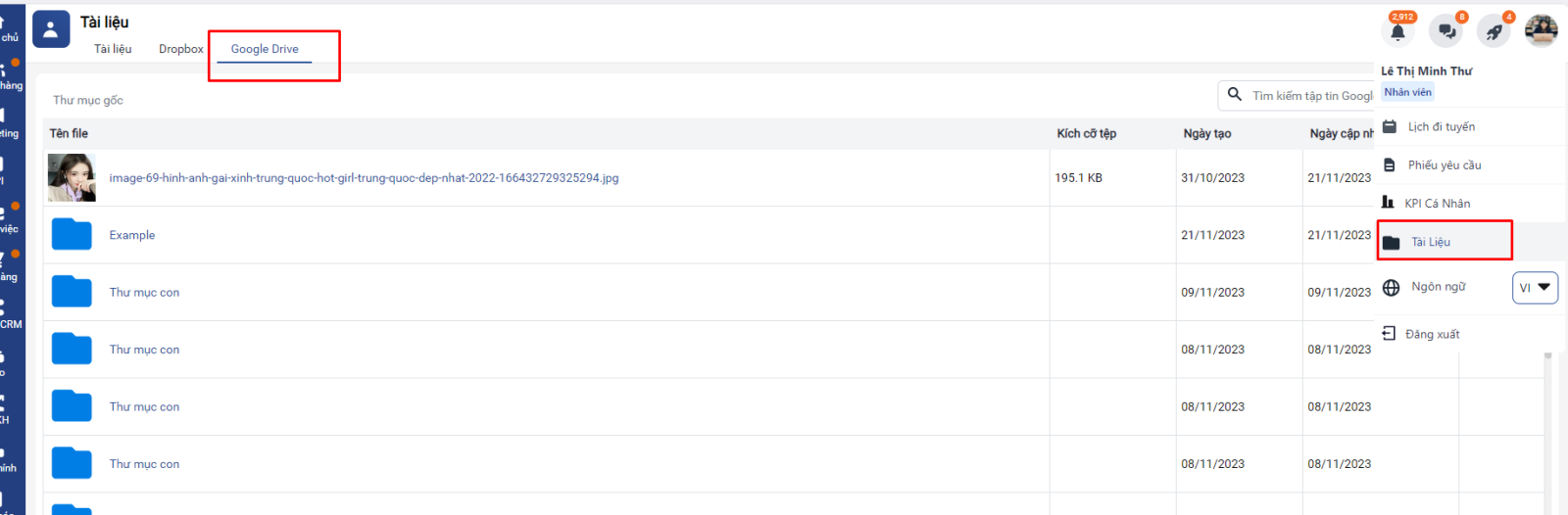 - Tích hợp với Google drive giúp người dùng: Đa dạng hóa nguồn dữ liệu lưu trữ, không giới hạn dung lượng và định dạng file upload (Tài liệu, khách hàng, công việc)