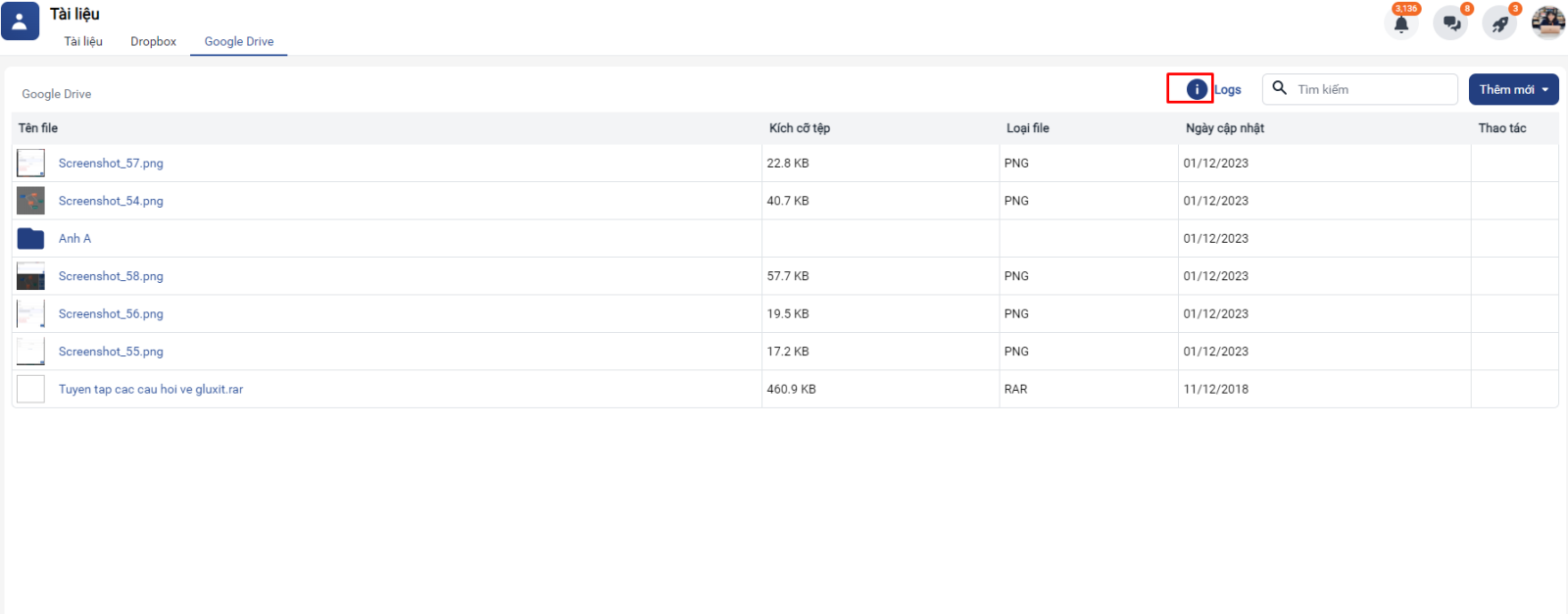 - Để xem lại logs đã thao tác trên google drive bạn vào "i' logs để xem phần này. Các logs thao tác sẽ được ghi nhận như sau: