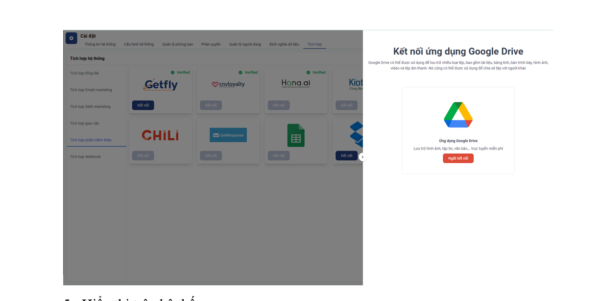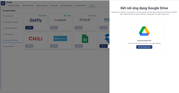Bước 1: Bạn vào mục cài đặt hệ thống -> chọn Tích hợp -> tích hợp phần mềm khác -> chọn Google Drive -> click kết nối: