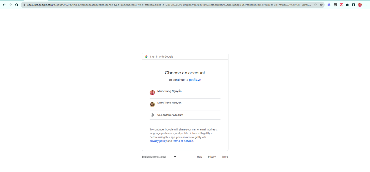 -Click kết nối sẽ điều hướng sang trang đăng nhập, nếu đã có tài khoản Google trong trình duyệt sẽ hiển thị danh sách để chọn: