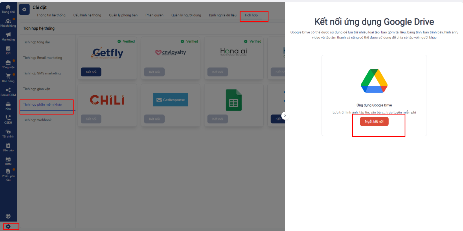 - Để ngắt kết nối với Google Drive với Getfly bạn vào mục cài đặt hệ thống -> chọn Tích hợp -> tích hợp phần mềm khác -> chọn Google Drive -> Ngắt kết nối.