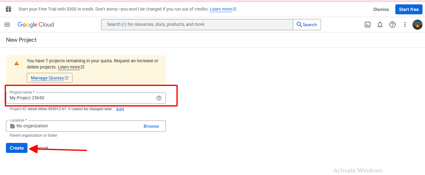 Mục Project name: đặt tên dự án bất kỳ và Bấm “Create”