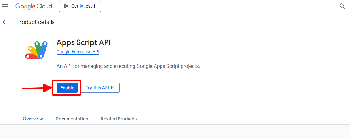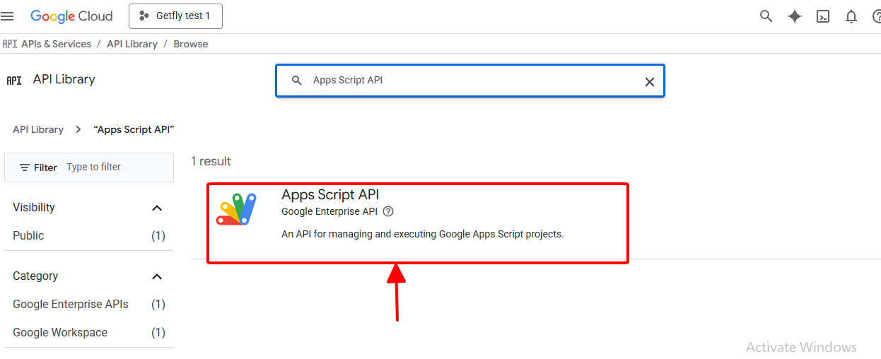 Sau khi gõ Enter, kết quả tìm kiếm hiển thị “Apps Script API”. Bấm vào “Apps Script API” như ảnh dưới