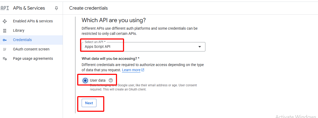 Sau đó, ở trường Select an API chọn “Apps Script API” và tích chọn “User data” và bấm “Next