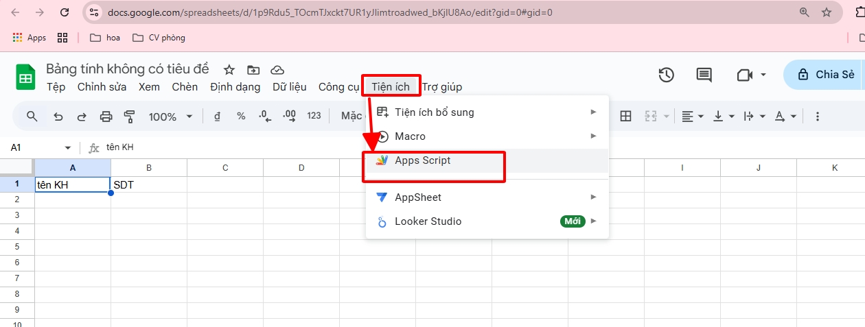 Tiếp theo mở tab mới, vào link Google Sheet cần đồng bộ > chọn Extensions (Tiện ích) > chọn Apps Script như ảnh dưới