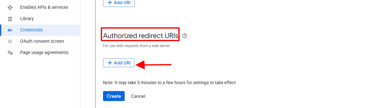 Bấm “+Add URI” trường “Authorized redirect URIs” và paste kết quả vừa mới copy ở bước 11 vào