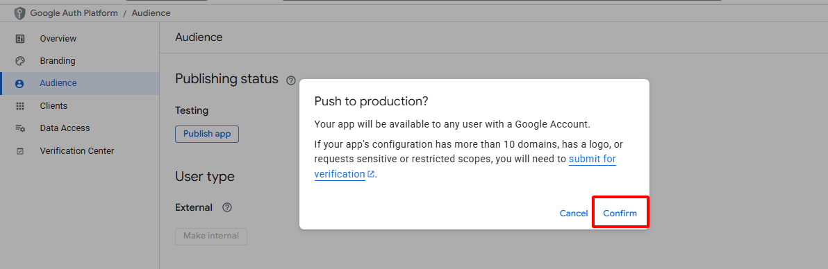 + Ở Publishing status -> bấm “Publish app” -> Bấm “Confirm”
