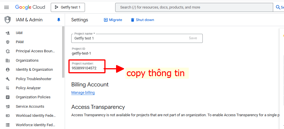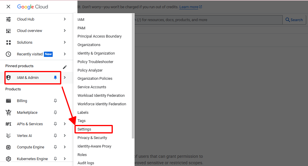 Click vào dấu 3 gạch để vào lại menu, chọn IAM & Admin > chọn Settings
