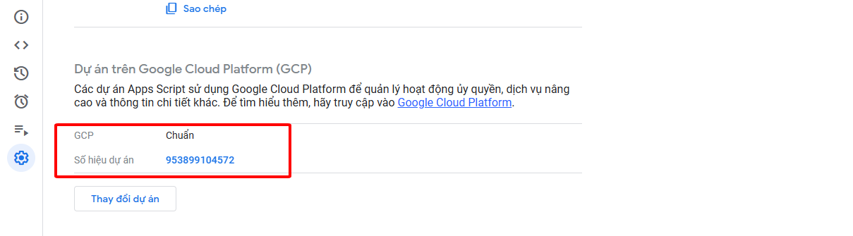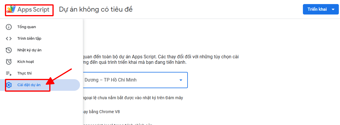 Quay lại màn hình Apps script của Google Sheet → chọn Project Setting (Cài đặt dự án)