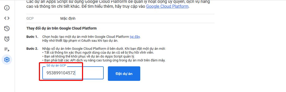 Tiếp theo paste “Project number” mà mới copy ở bước 16 và ấn “Set project” ( Đặt dự án)