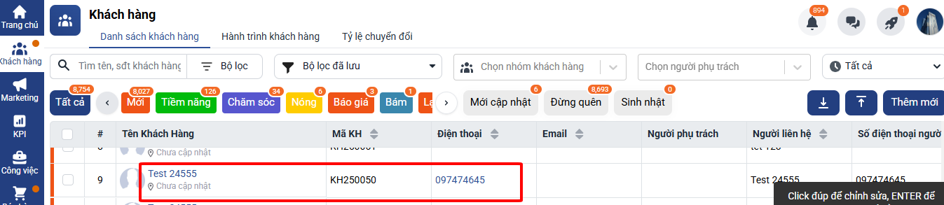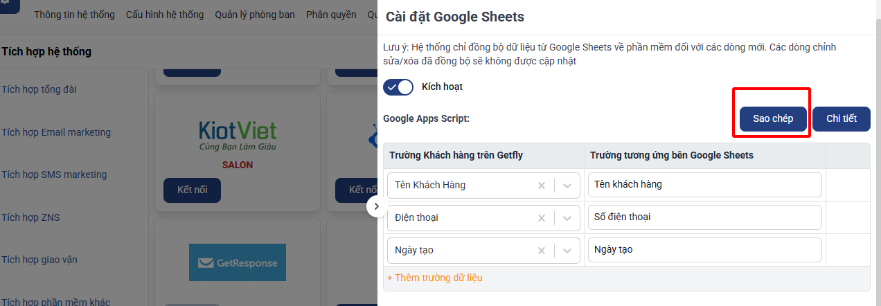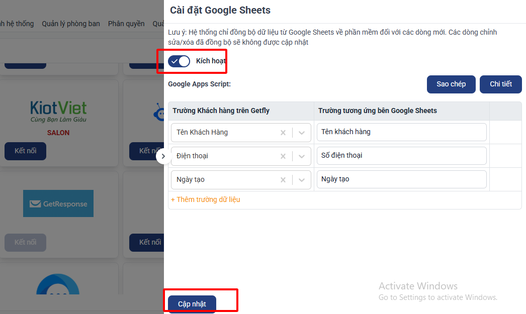 Ví dụ: Tên Khách hàng trên Getfly ứng với cột tên KH trong bảng tính sheet + Bật Kích hoạt và ấn Cập nhật
