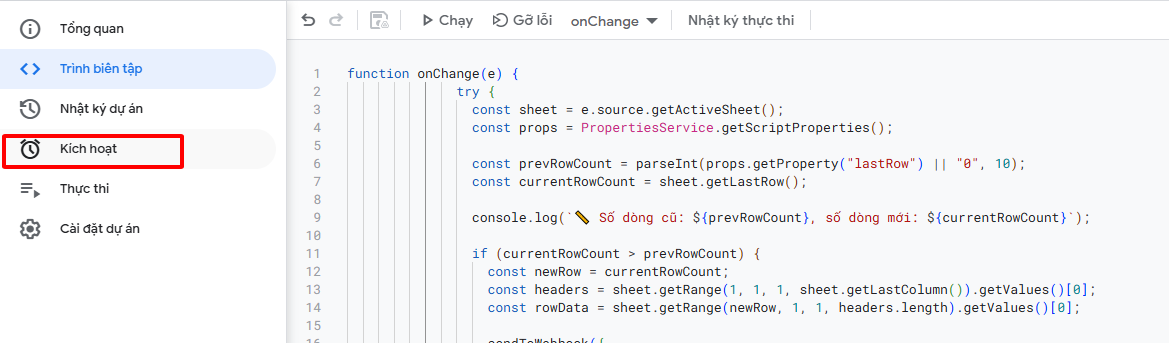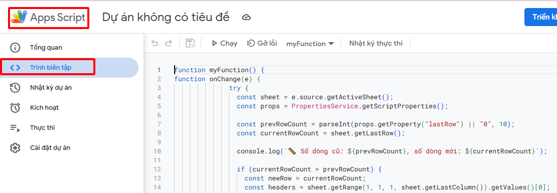 Quay lại màn hình Apps script của Google Sheet → chọn Editor ( Trình biên tập)