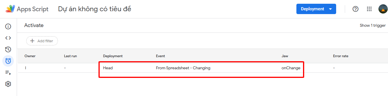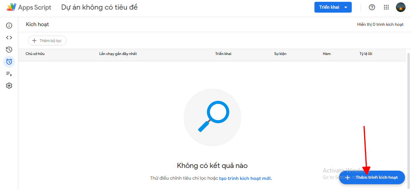 Tiếp sao ấn vào “Triggers” (Kích hoạt) như sau:
