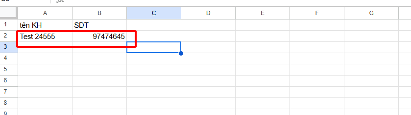 Mở bảng tính google sheet, thực hiện thêm 1 dòng mới để kiểm tra