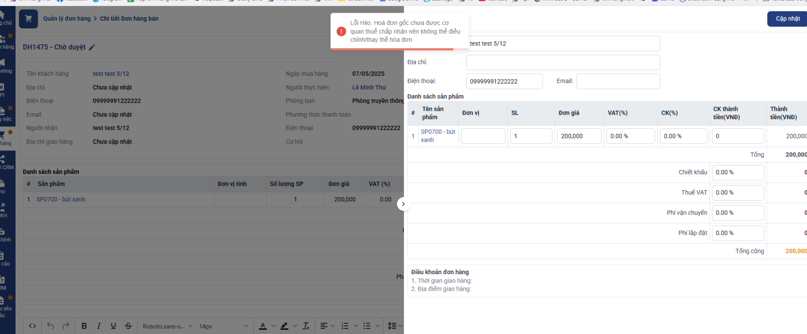 + Nếu cập nhật thay thế hóa đơn không thành công có thể hóa đơn gốc chưa được cơ quan thuế chấp nhận điều chỉnh thay thế hóa đơn, bạn cần kiểm tra lại với nền tảng Hilo Invoice: