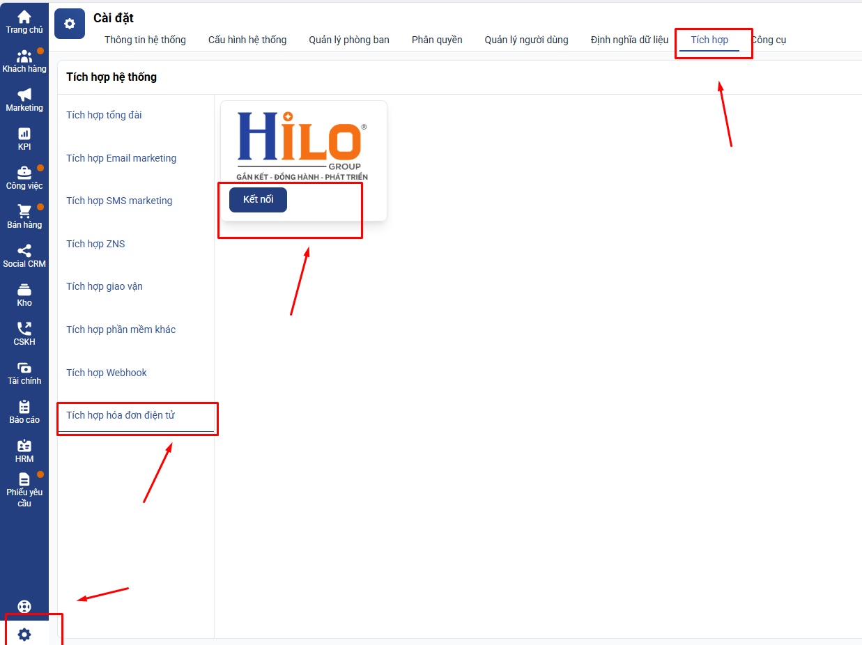 Bước 1: Bạn vào mục cài đặt => tích hợp => tích hợp hóa đơn điện tử => chọn Hilo Invoice: