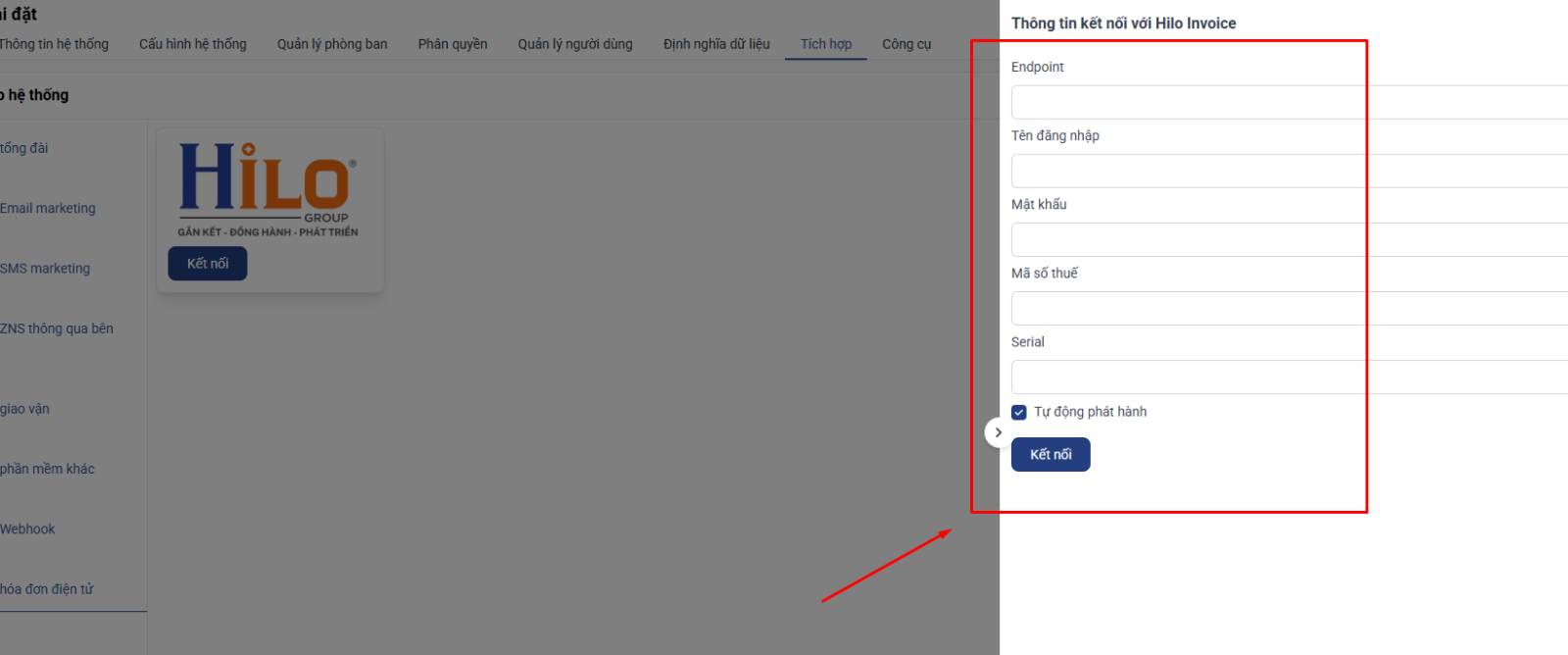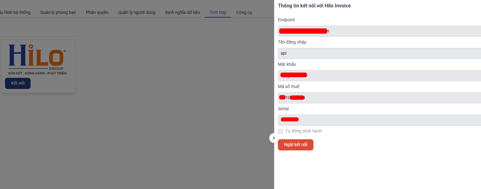 Bước 2: Điền các thông tin kết nối do bên Hilo Invoice cung cấp => ấn tự động phát hành và kết nối: