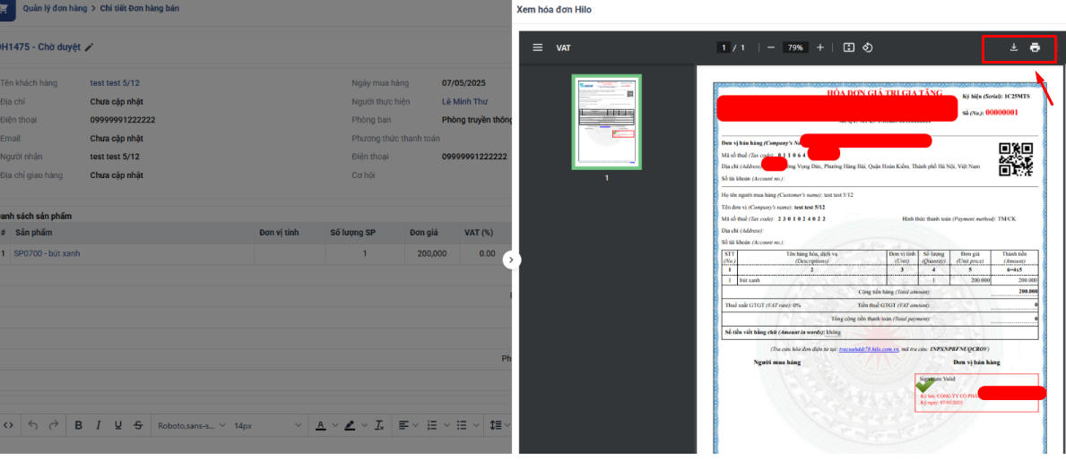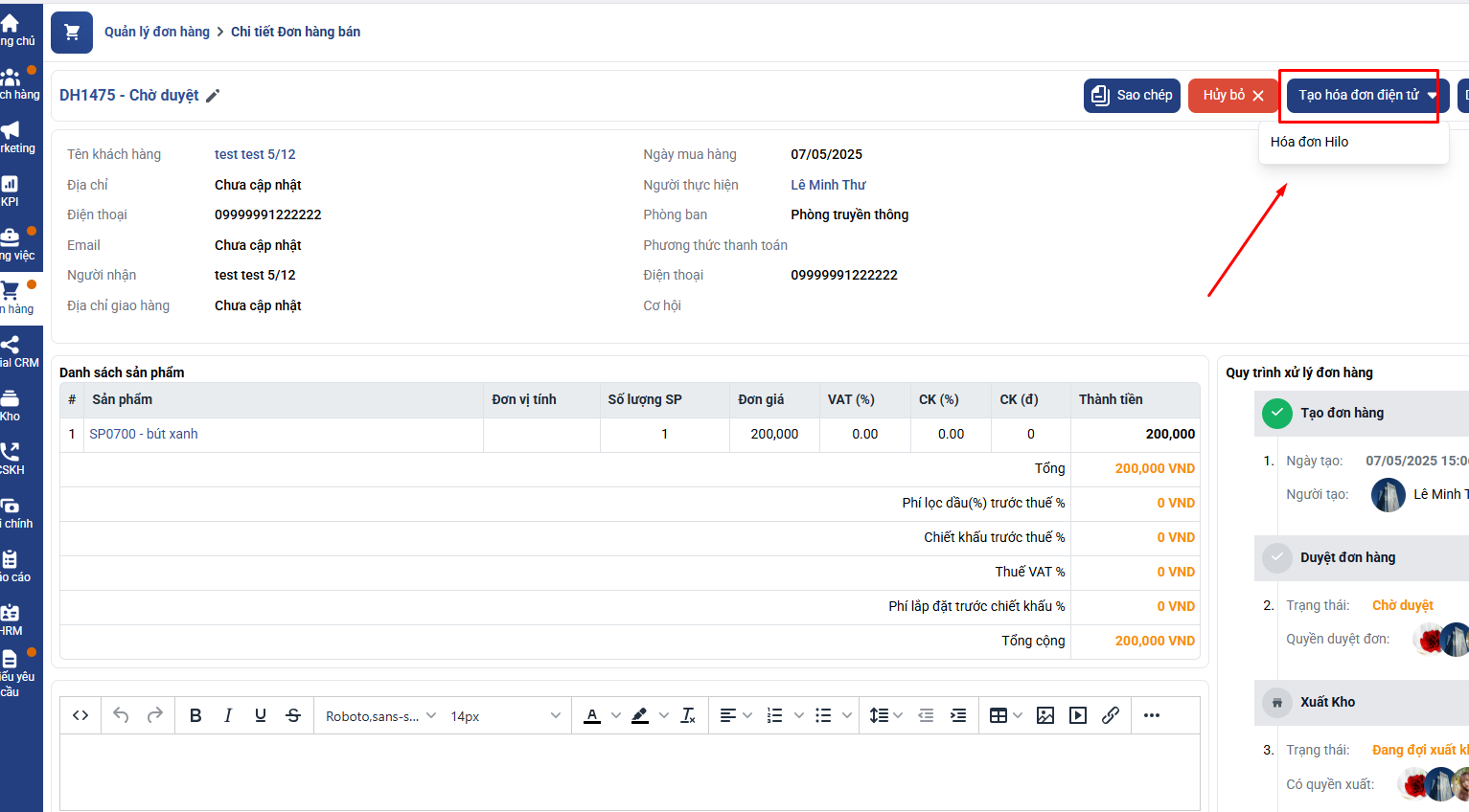 - Các bạn vào chi tiết đơn hàng bán => ấn nút tạo hóa đơn điện tử và chọn hóa đơn Hilo Invoice :