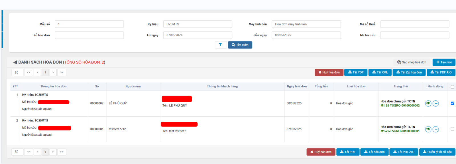 - Click vào mã hóa đơn, bạn có thể xem nhanh hóa đơn điện tử hoặc in hóa đơn và tải hóa đơn điện tử về máy tính dưới dạng PDF: