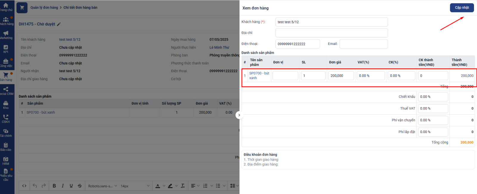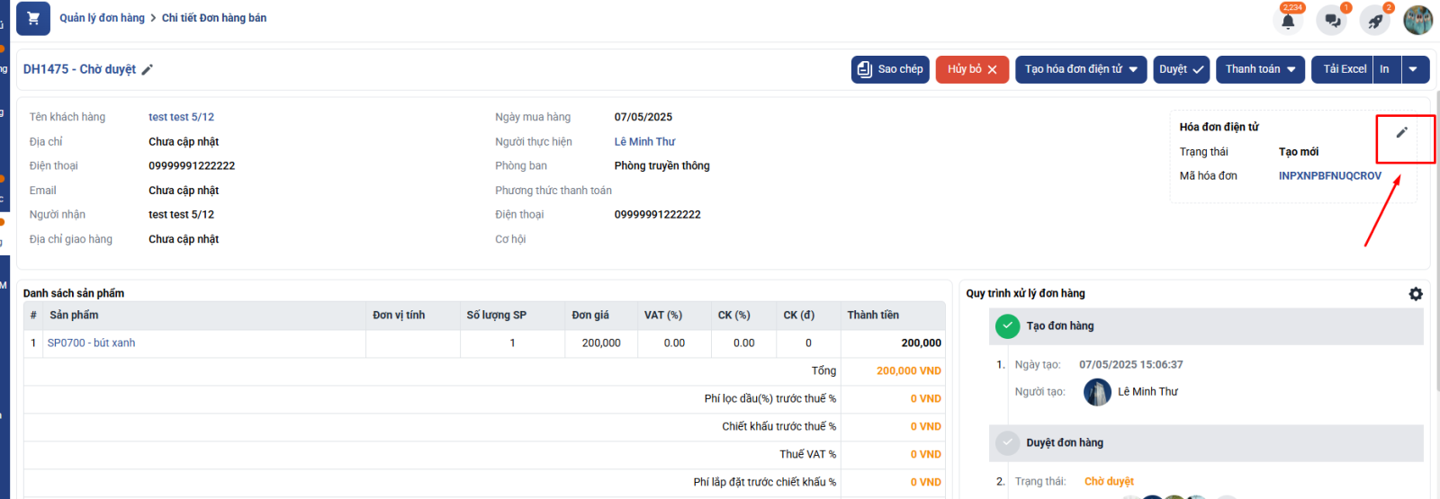 - Sau khi tạo hóa đơn thành công hệ thống sẽ hiển thị trong chi tiết đơn hàng mã hóa đơn và trạng thái hóa đơn:
