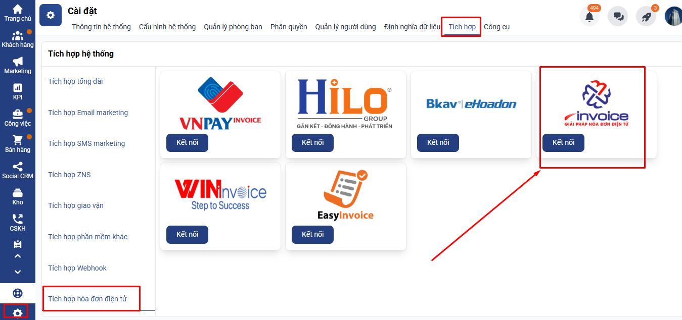 Bước 1: Bạn vào mục cài đặt => tích hợp => tích hợp hóa đơn điện tử => chọn M-Invoice